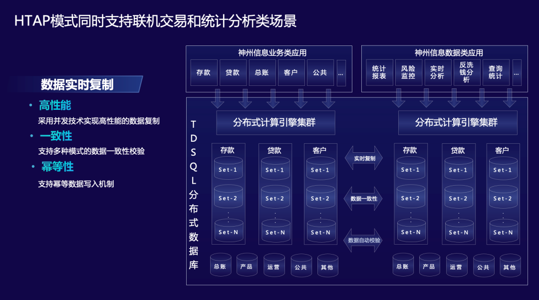 依托腾讯云金融级分布式数据库TDSQL作为此次解决方案的核心系统承载,凭借“强一致”、“高性能”、“高可用”、“高兼容”、“高透明”、“平滑扩容”等优势,面向金融行业分布式架构提供了跨区容灾、多地多中心、故障自动恢复等能力,保障业务稳定高效运行。同时能够支撑实时交易级业务与数据类业务的HTAP数据融合能力,为交易级系统提供大数据在线统计分析能力,可为交易级业务提供统计报表、风险监控、实时分析及各类查询统计数据服务。